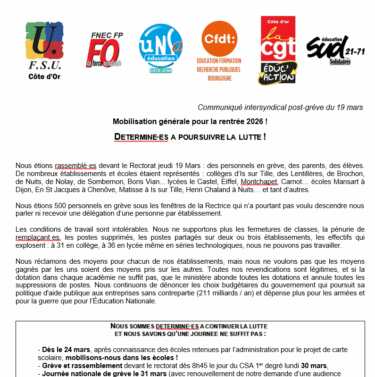 Grève contre les suppressions de postes dans le 1D et 2D dans le 21. Manifestation de la place de la Libération au Rectorat jeudi 19 mars. Départ 14h.