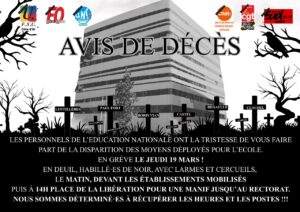 Grève contre les suppressions de postes dans le 1D et 2D dans le 21. Manifestation de la place de la Libération au Rectorat jeudi 19 mars. Départ 14h.
